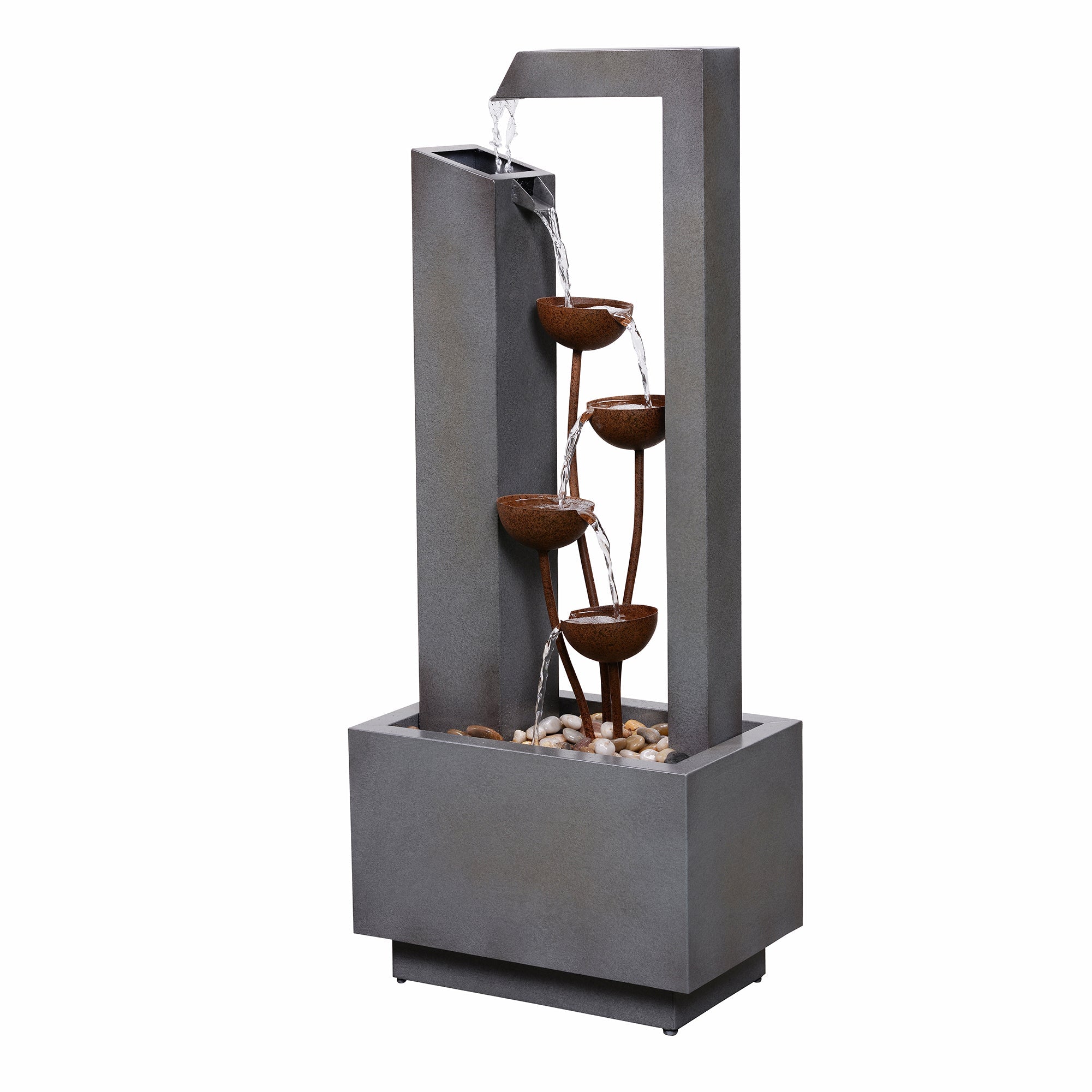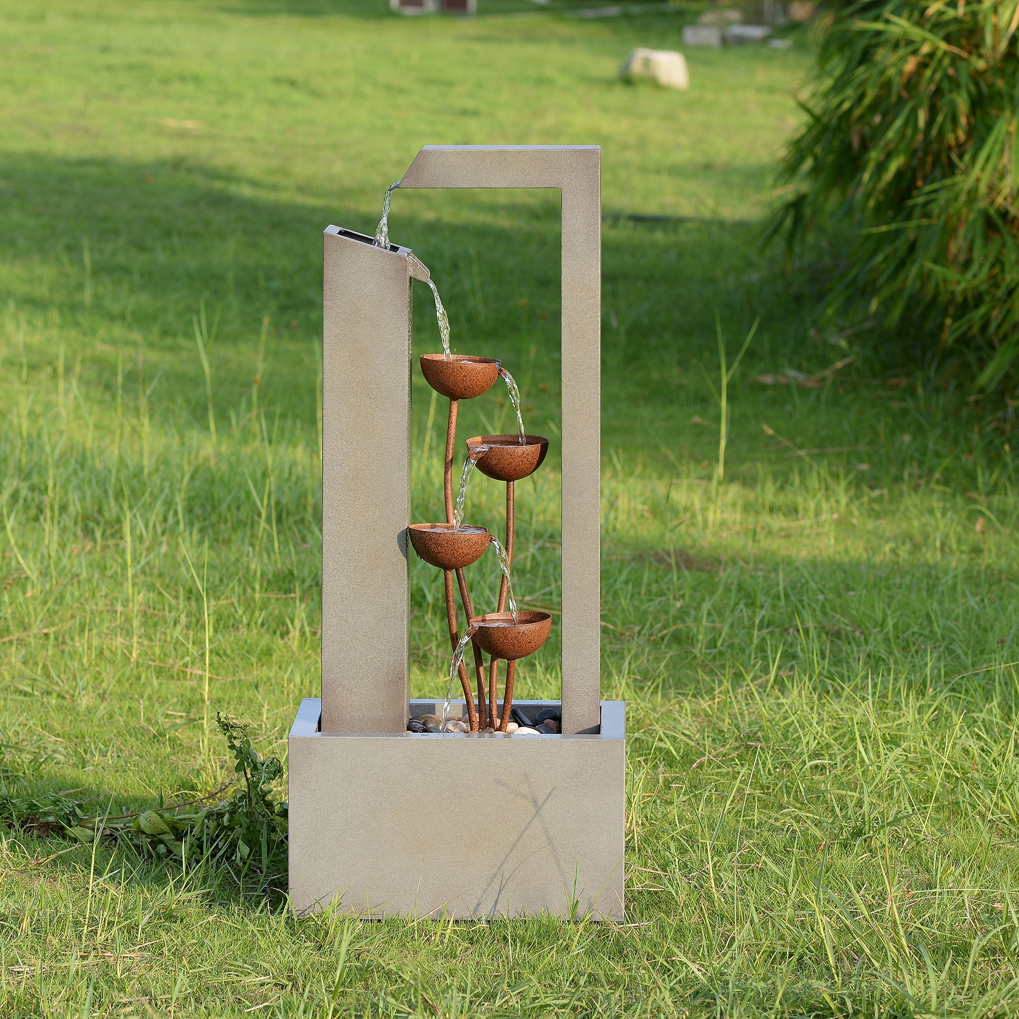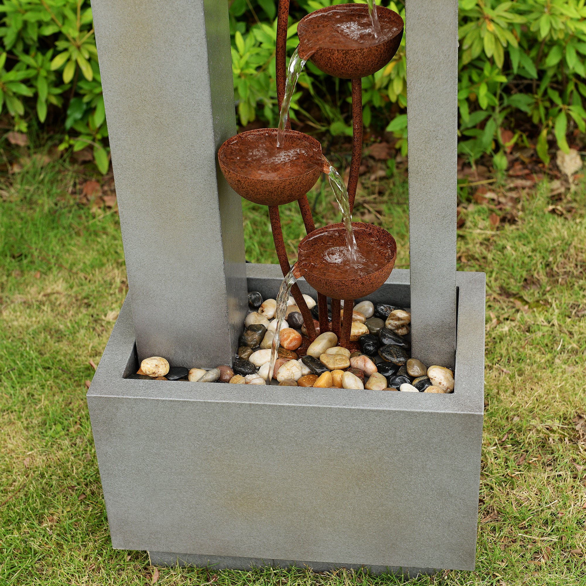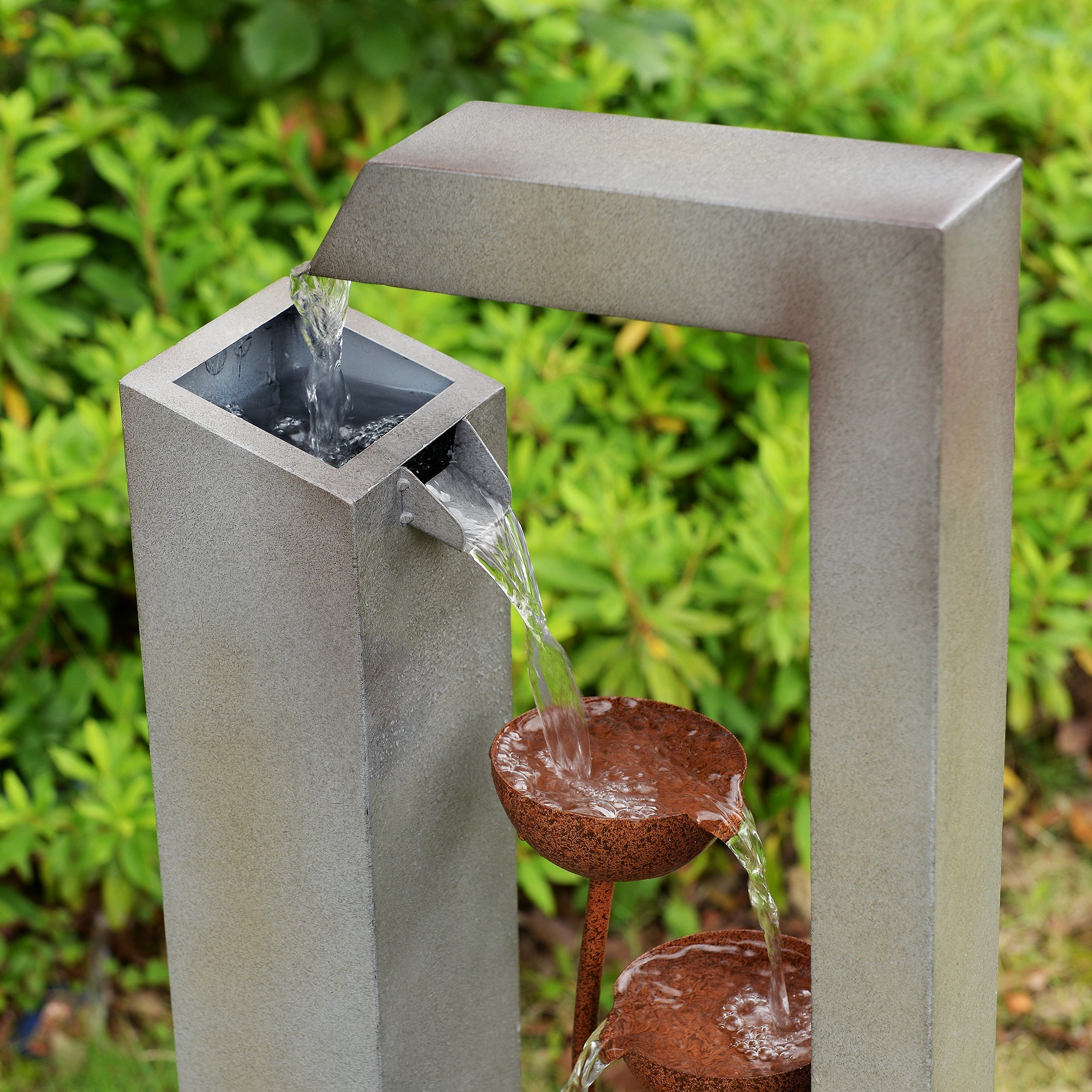 This elegant three-tiered fountain adds a touch of sophistication to any outdoor space. Constructed from durable galvanized sheet metal and featuring a sleek grey finish, it includes a built-in planter for added versatility. Powered by AC and designed for easy setup, this fountain offers both decorative and functional value for your garden or patio.