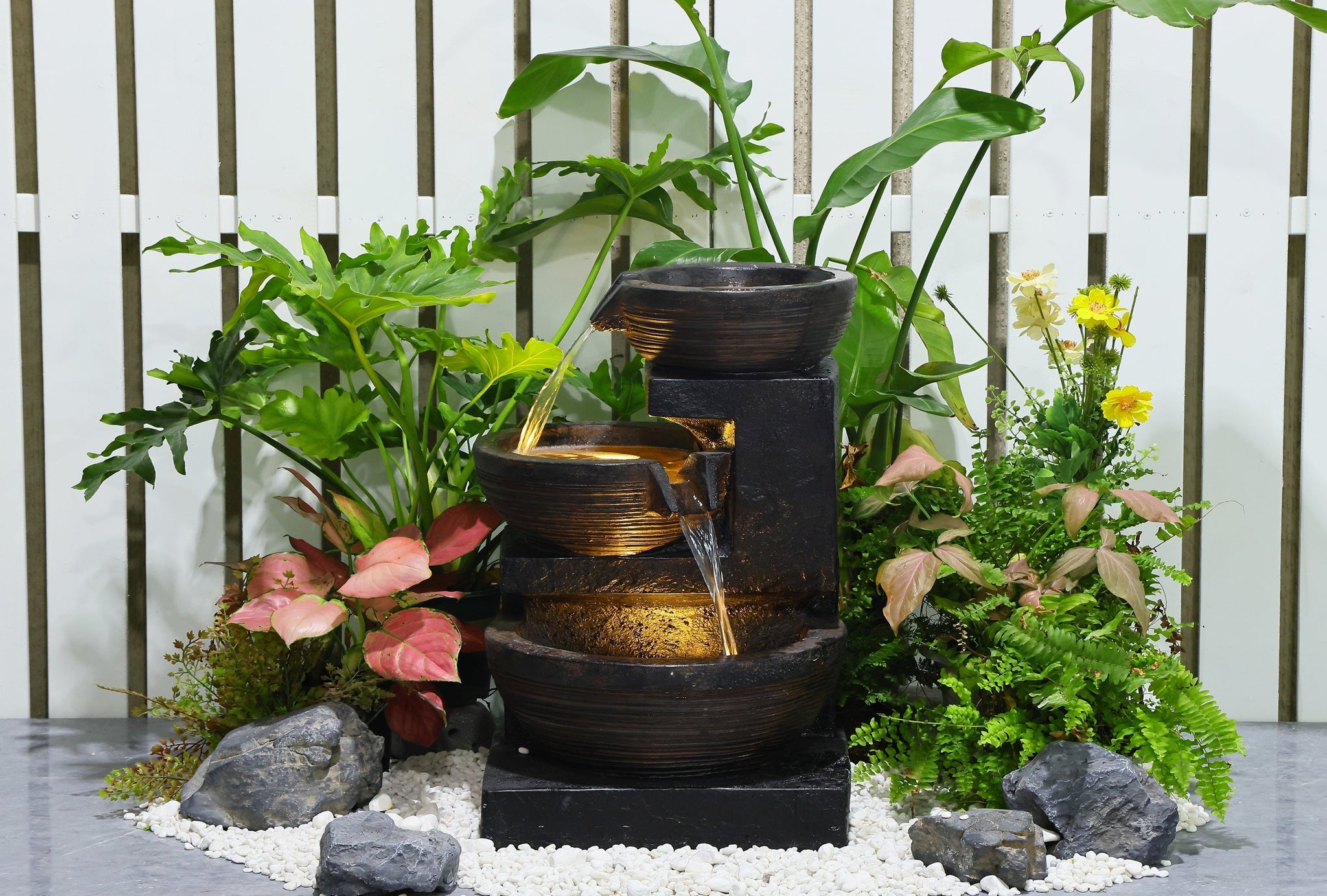 Introducing our Outdoor Fountain with 12 Warm White LED Lights and a 450l/h Pump. Crafted from durable polyresin, this fountain stands 5.9 feet tall, creating an impressive visual display. The warm white LED lights illuminate the cascading water, casting a captivating glow. Designed for outdoor use, it adds elegance to gardens and patios. The CSA/CUL approved adapter (model# JXA-12V300-IP44) ensures safe operation. With a flow rate of 450 liters per hour, the pump provides a steady water flow. Enjoy the soothing ambiance of flowing water and gentle illumination, transforming your outdoor space into a haven of tranquility.