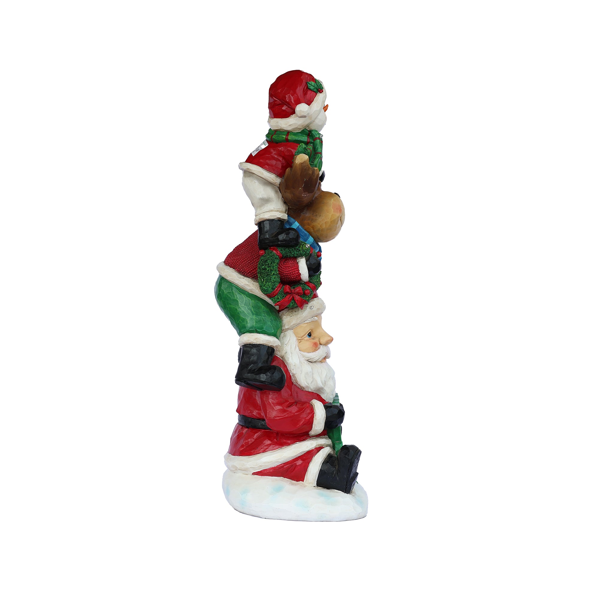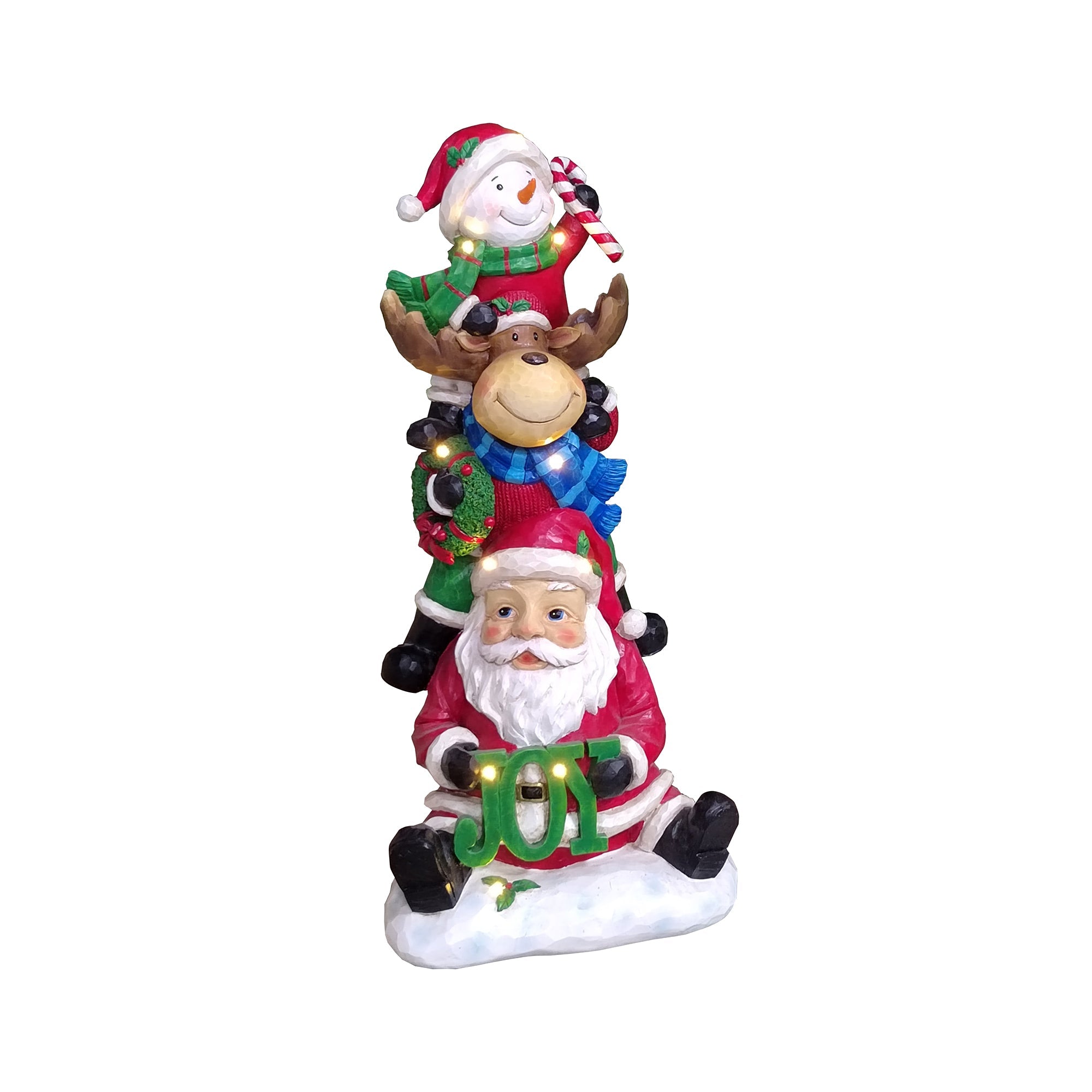 Snowman, elk and snowman stacked atop one another. This statue has been painted with such lovely detail and has a beautiful gloss finish. Light on it to enjoy the beautiful bright glow and transform your Christmas experience.