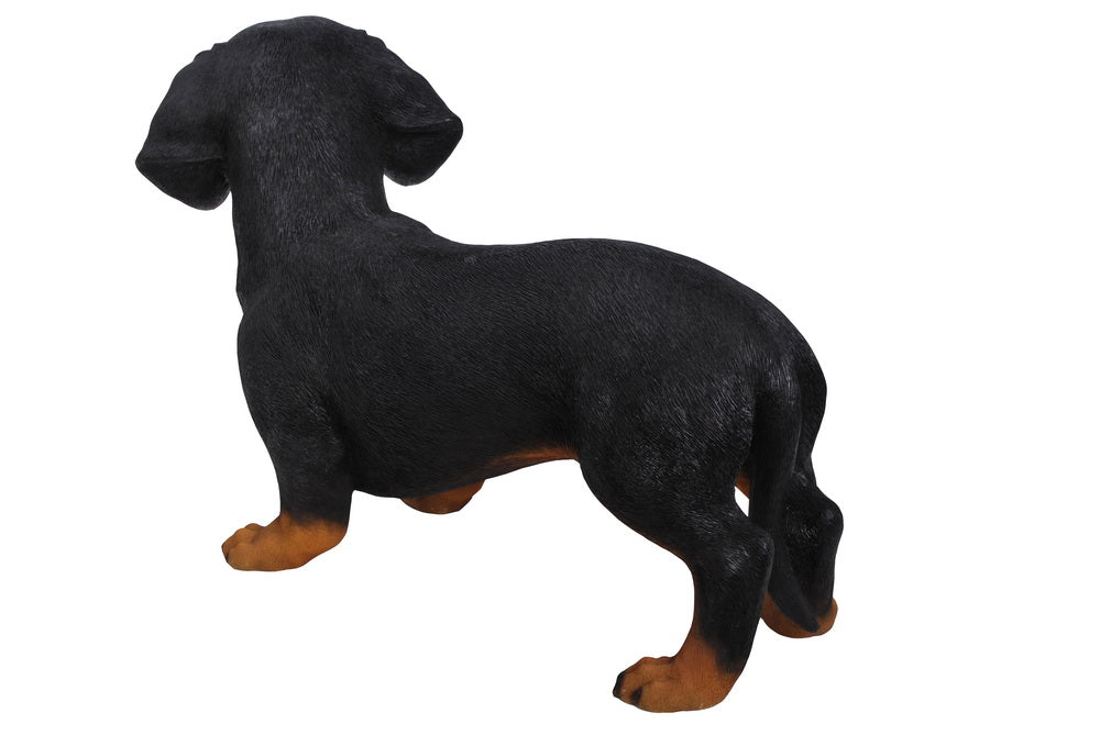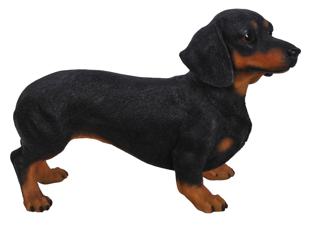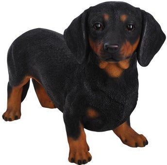 "Product Description: Dog-Dachshund This irresistable dachshund has a refined dark coat. True to life glossy brown eyes are staring out. This realistic depiction of man's best friend is made with polyresin, and is perfect for both indoor and outdoor exhibit. Makes a great gift for dog lovers. Size: 13.5"" High Composition: Poly-resin Color: Black/Brown"