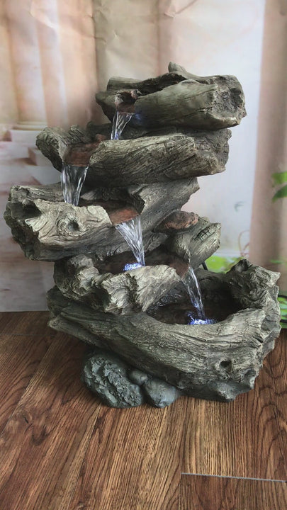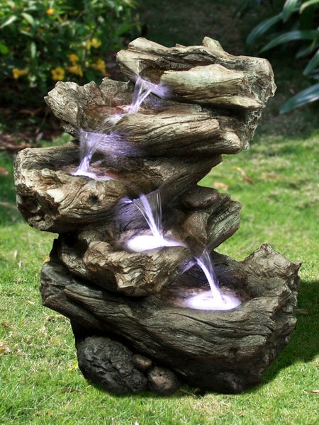 This multi-level fountain features portions of logs that have been stacked upon one another. Also features beautiful LED light on every level.