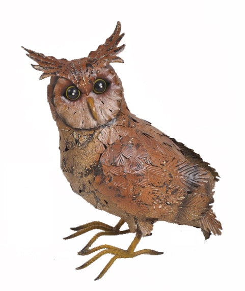 A brown metal owl with its wings tucked giving by standers a wide eyed look. Perfect for your lawn or garden.