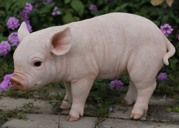 Product Description: Standing baby pig figurine with black spots and life like details is good for both indoors and outdoors. Makes a perfect gift for farm animal lovers. Composition is Polyresin