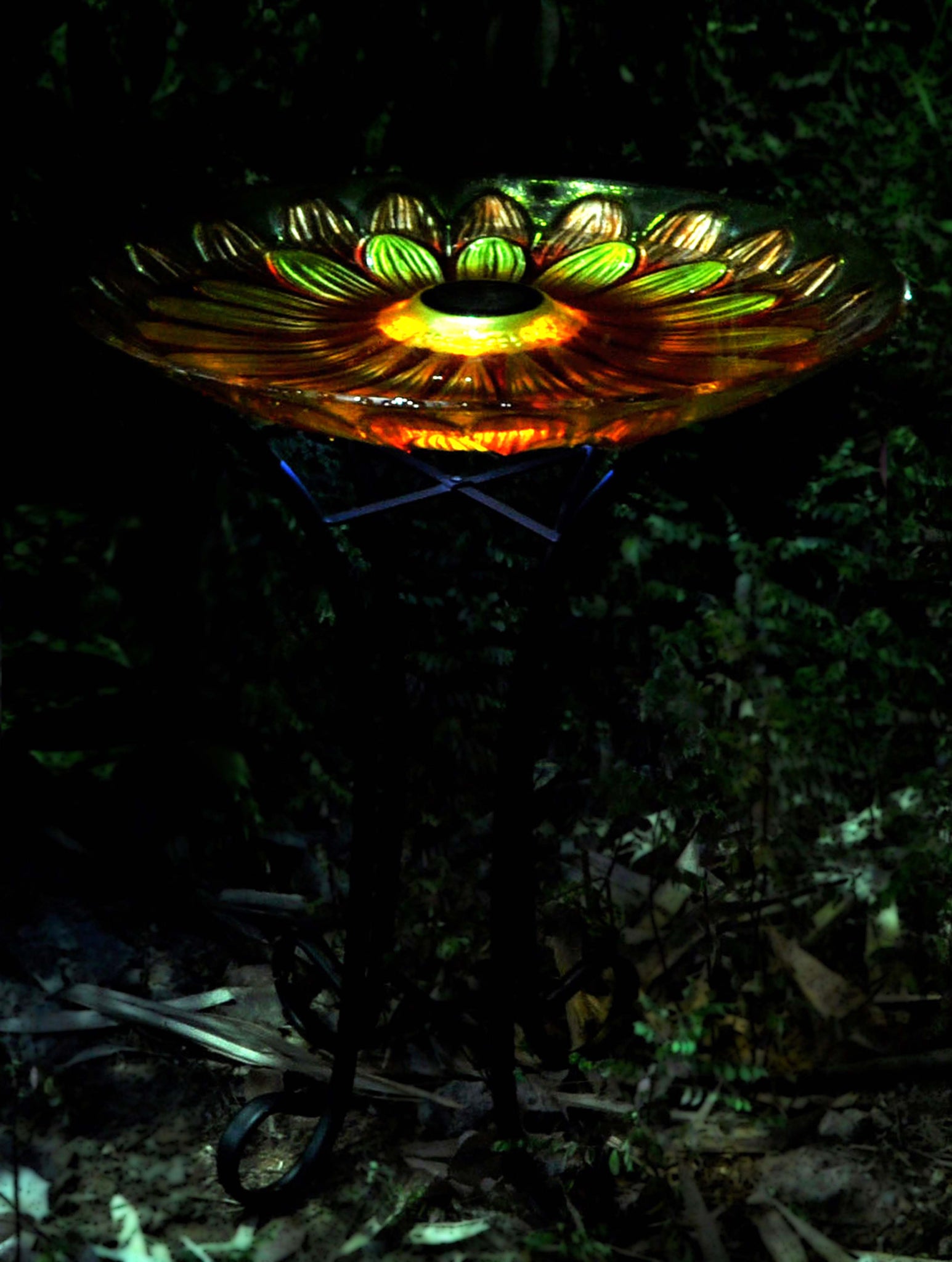 Stunningly designed with a large colourful floral bowl, this bird bath will attract your backyard birds for hours of viewing pleasure. A four-legged metal stand is included and the solar panel lights up in the darkness.