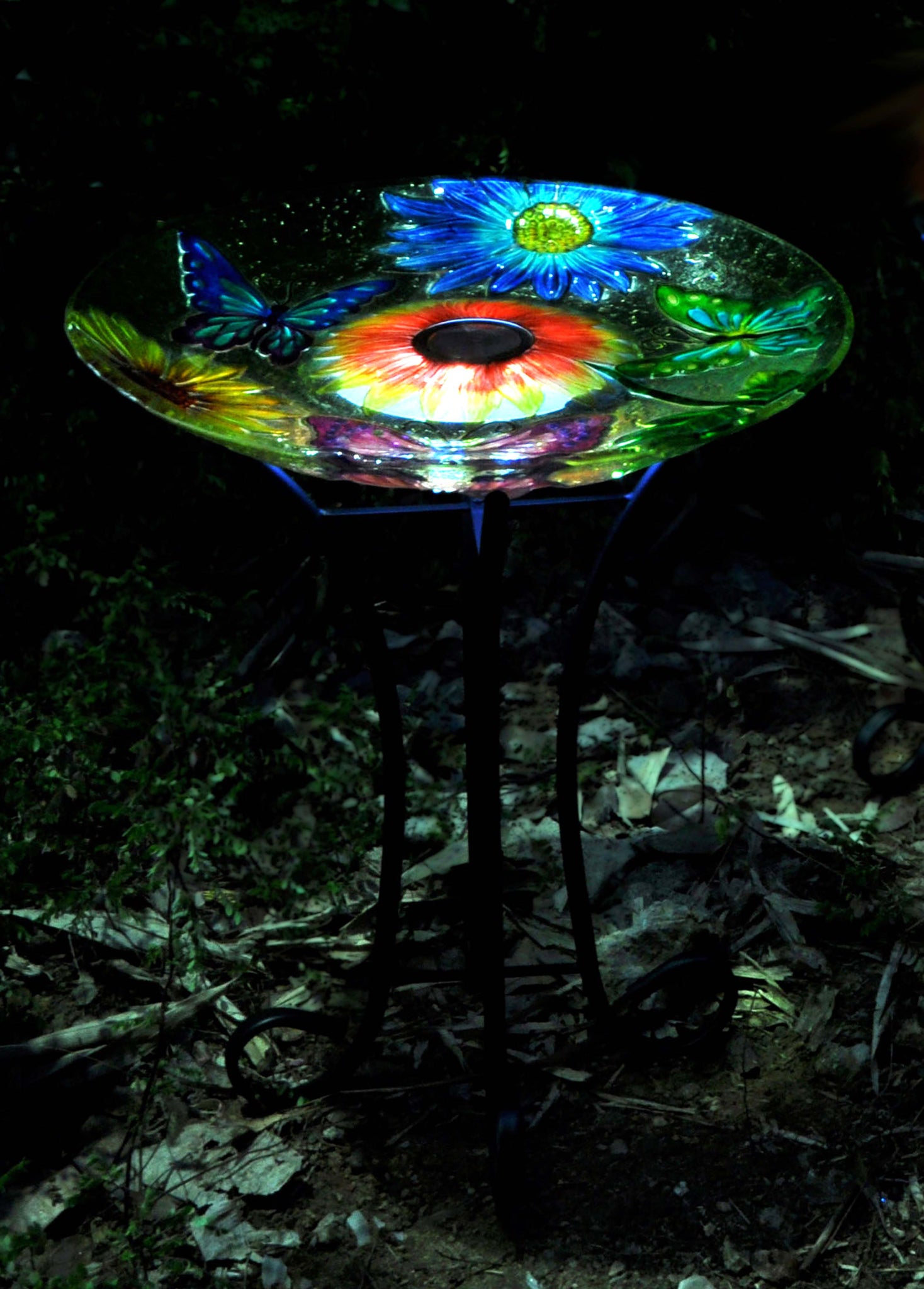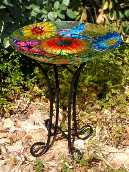 Stunningly designed with a large colourful floral butterfly bowl, this bird bath will attract your backyard birds for hours of viewing pleasure. A four-legged metal stand is included and the solar panel lights up in the darkness.