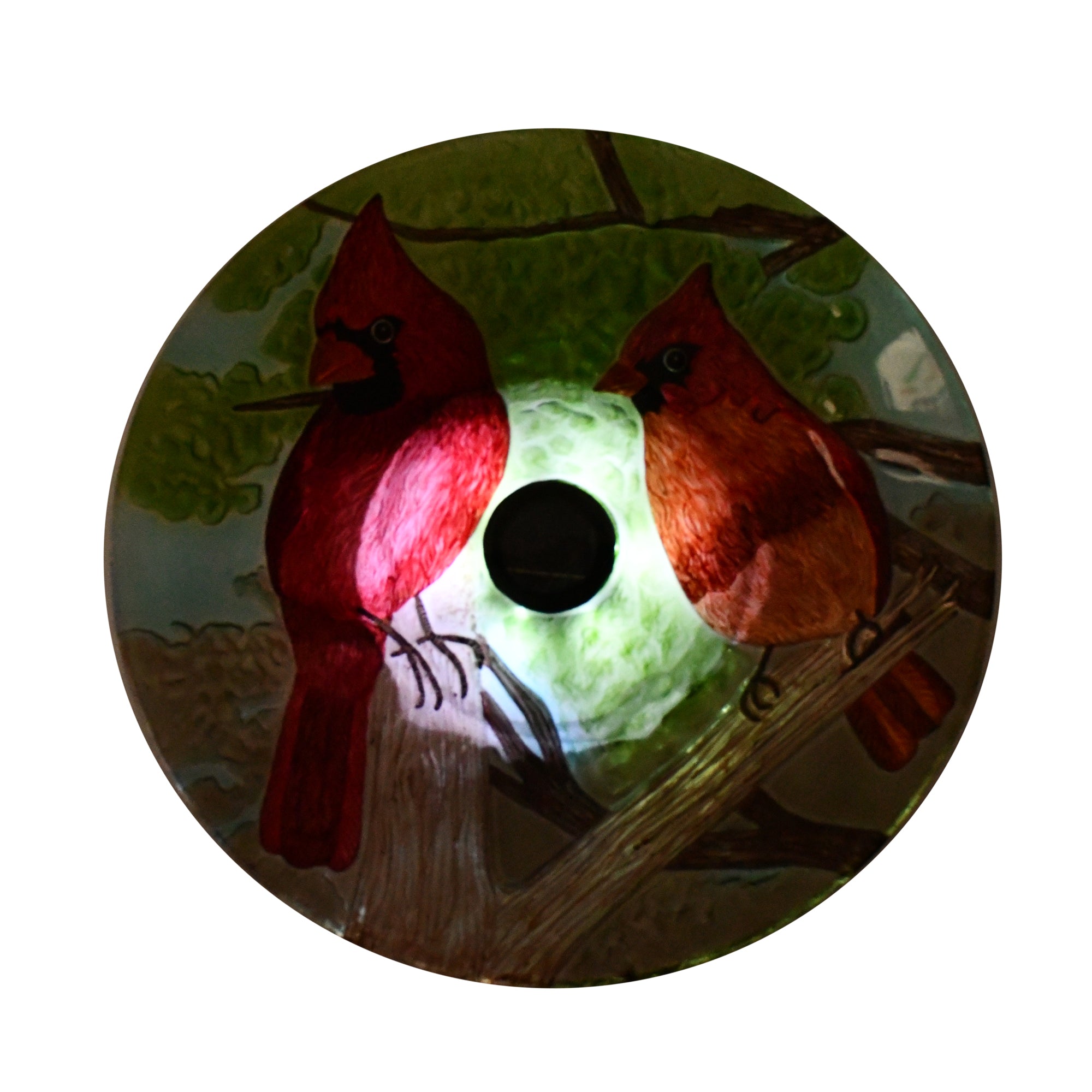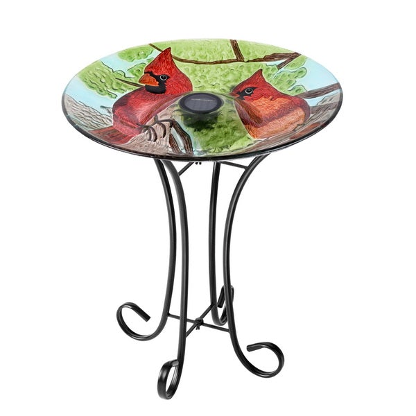 Stunningly designed with a large colourful bowl, this bird bath, featuring two cardinals will attract your backyard birds for hours of viewing pleasure. A four-legged metal stand is included and the solar panel lights up in the darkness.