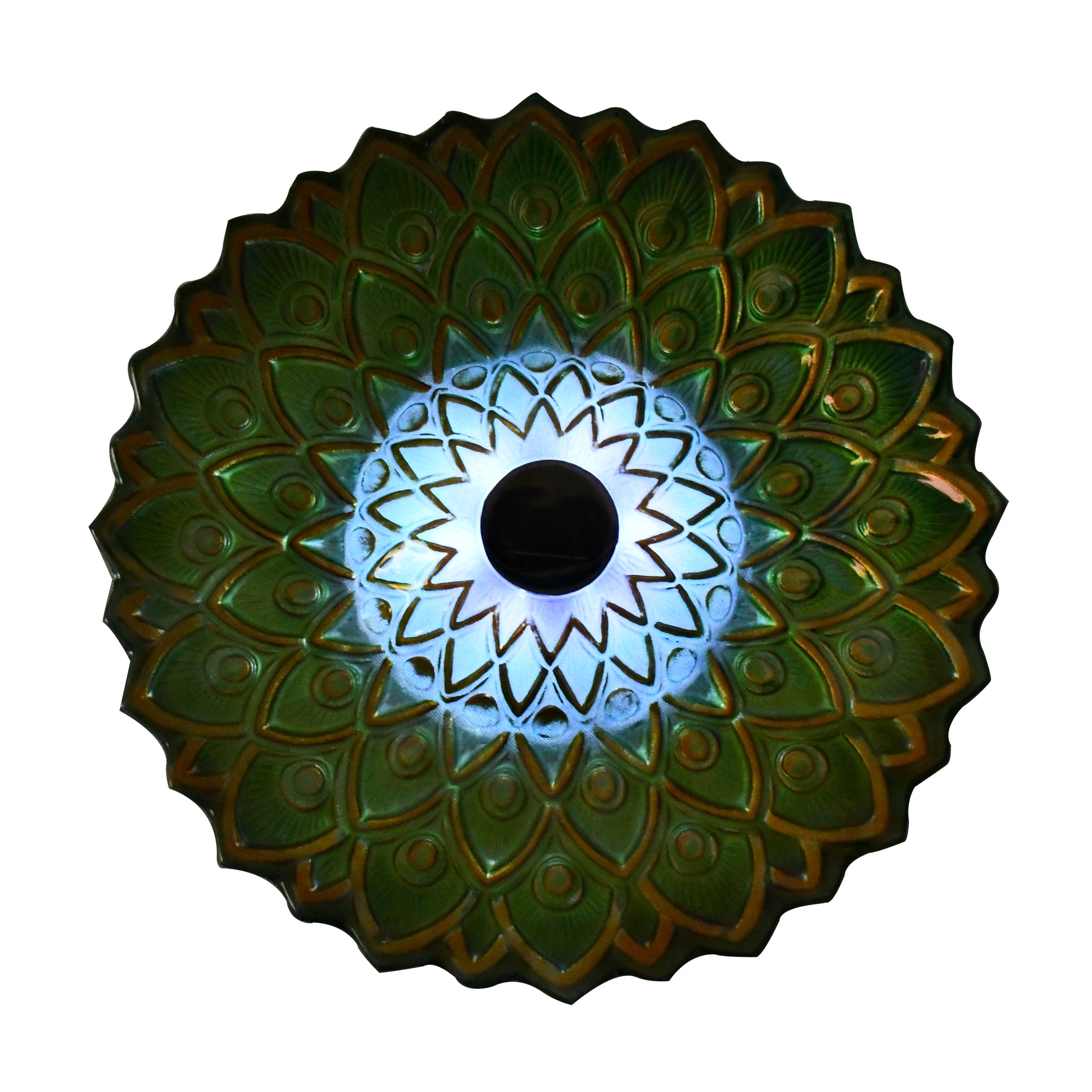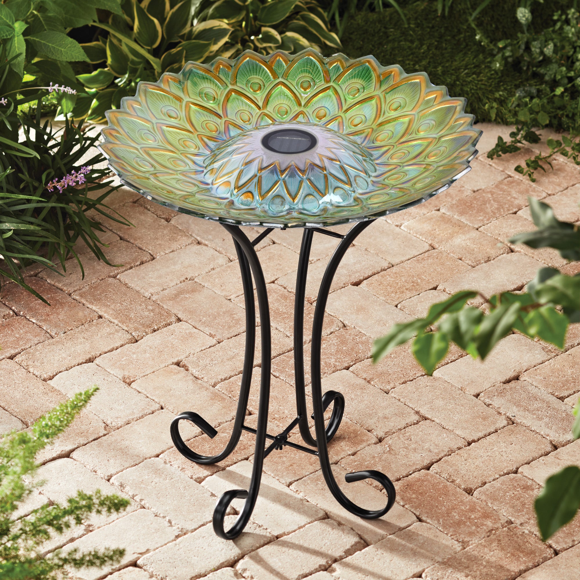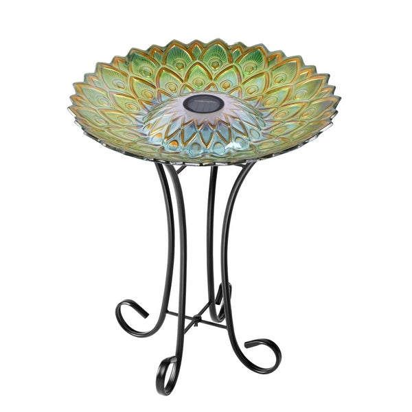 Stunningly designed with a large colourful bowl, this bird bath, featuring a peacock-inspired green geometric pattern, will attract your backyard birds for hours of viewing pleasure. A four-legged metal stand is included and the solar panel lights up in the darkness.