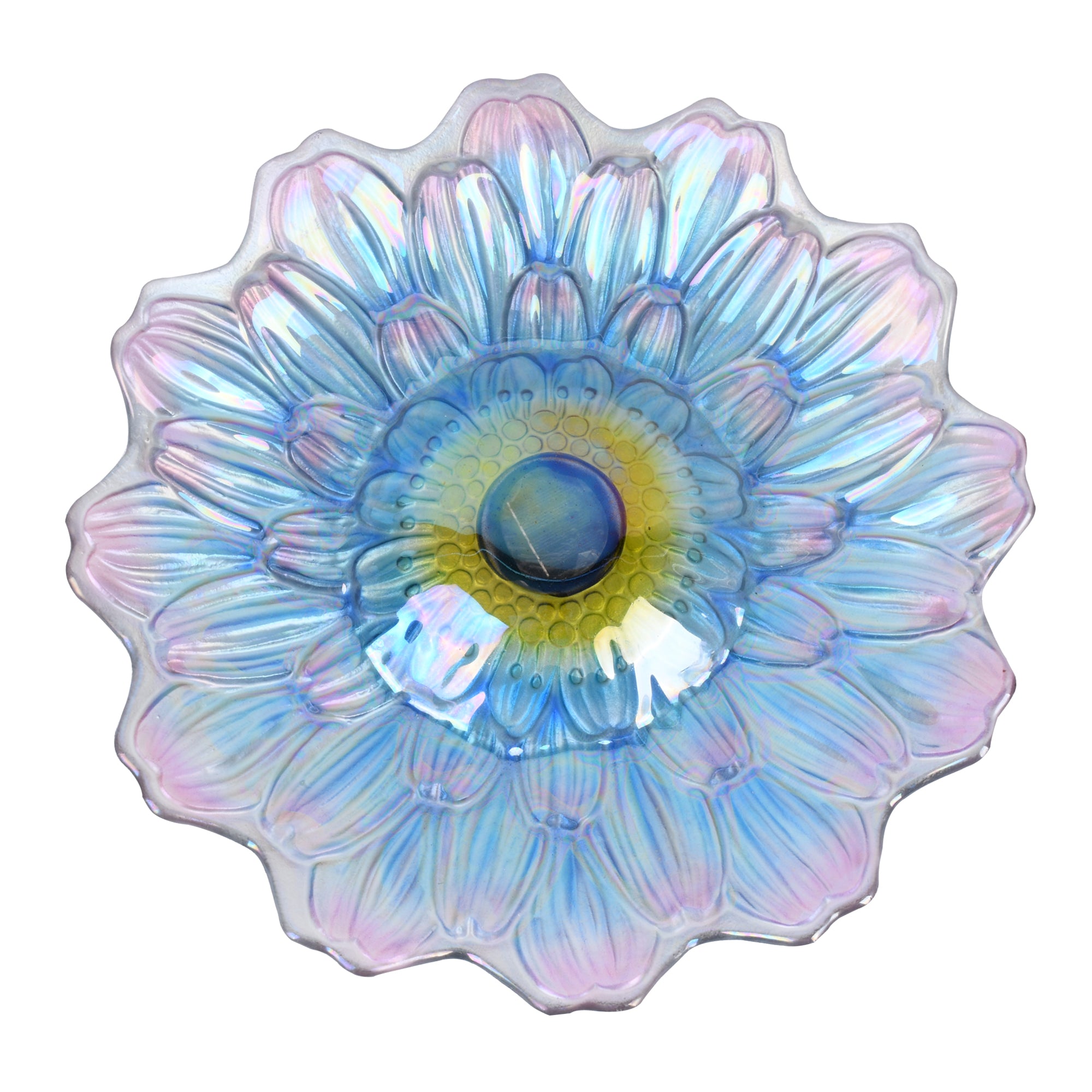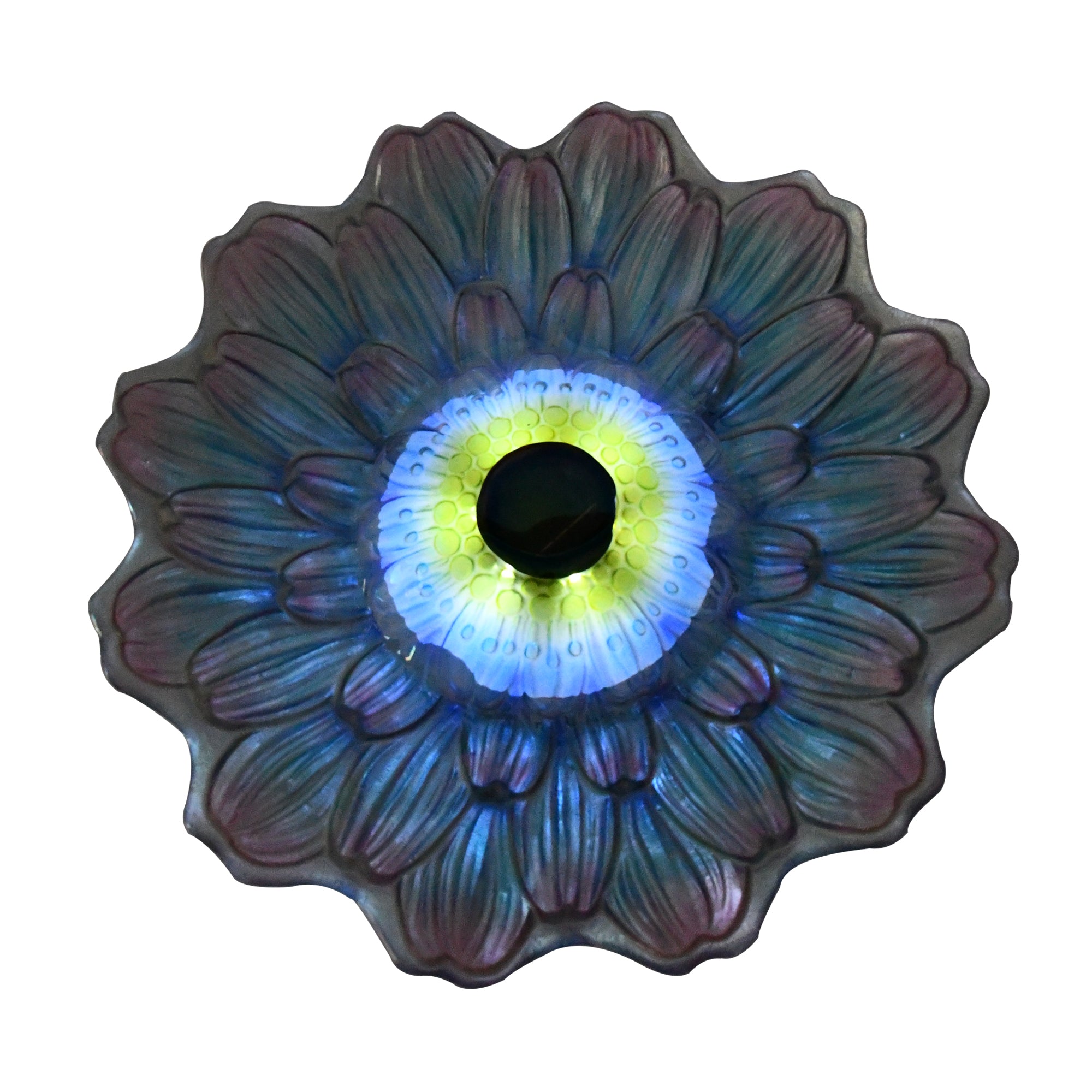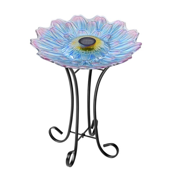 Stunningly designed with a large colourful bowl, this bird bath, featuring a blue and purple dahlia, will attract your backyard birds for hours of viewing pleasure. A four-legged metal stand is included and the solar panel lights up in the darkness.