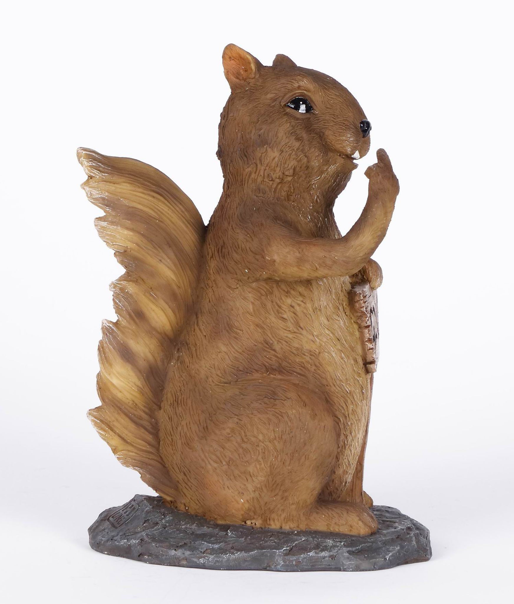 Add a dash of fun to your garden with this 9.25-inch tall squirrel statue featuring holding a "go away" sign in one hand and a cheeky "flipping the bird" gesture with the other. This playful duo brings a smile while gently telling unwanted guests to keep their distance. Perfect for brightening up any outdoor space with a touch of whimsy and personality.